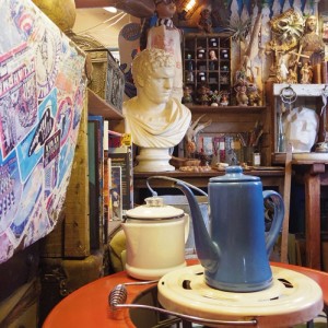西戸崎の海近くにある穴場的アンティークショップ。『MARINFORD』のフラッグがはためく奥には、何やら気になる一軒家への入口が…。海賊船の雰囲気漂う中、古着、古道具、アンティークな小物の数々、ファイヤーキングや昭和なレトロ雑貨までがところ狭しと並んでいる。